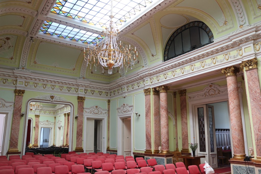 Pianul de concert și candelabrul din Marea Sală a Oglinzilor, donate de urmașii familiei Marincu, amintesc de vremuri bune, prospere și cosmopolite…