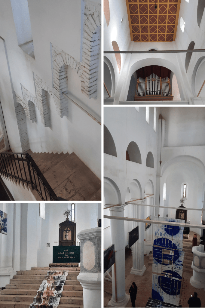 De la tribuna care găzduiește orga nouă (cea veche fiind distrusă în 1944), la care a ajuns pe o scară îmblânzită de arcele însoțitoare de pe peretele de care e zidită, privitorul se bucură de stilul copleșitor de simplu al colonadei care-i îndrumă pașii pe sub tavanul casetat.Poate ședea într-una dintre băncile de lemn sau doar lângă peretele curat pentru a vedea și mai clar calea de urmat.