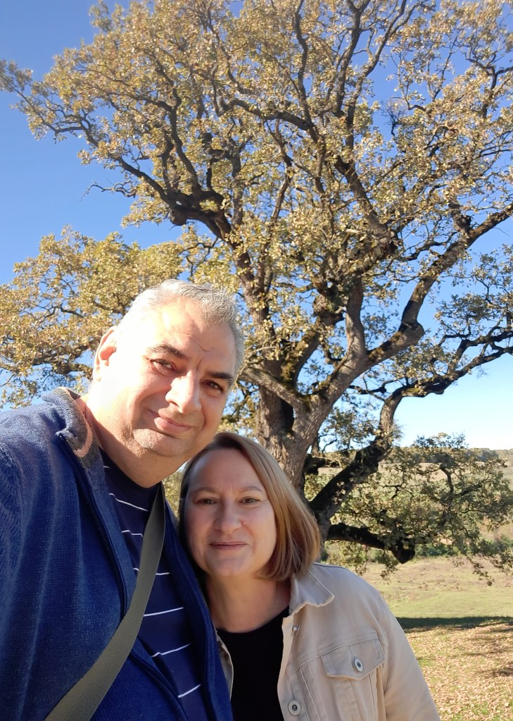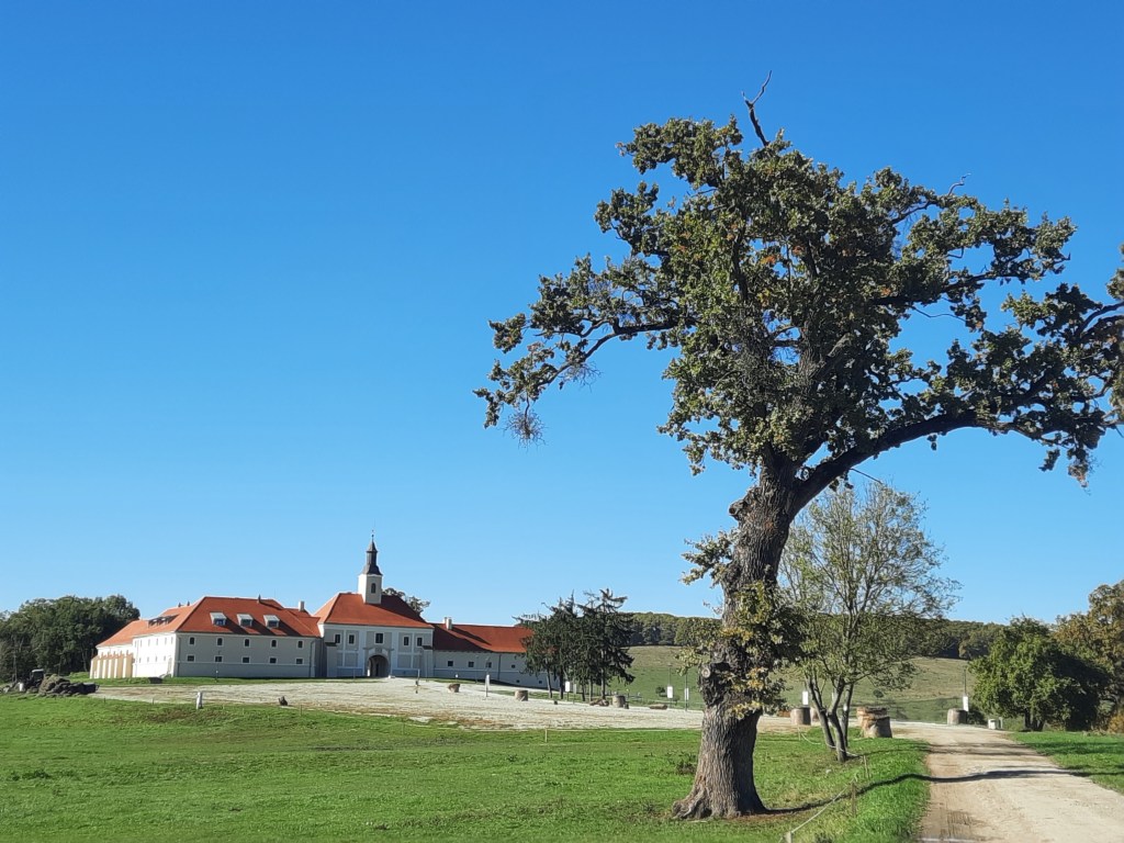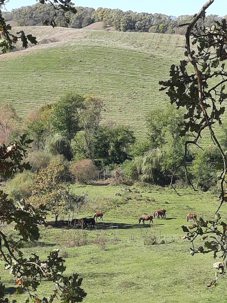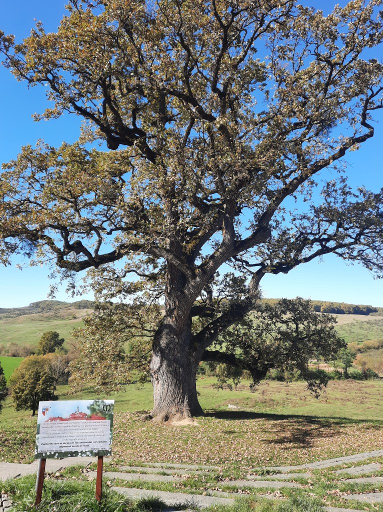 Cel mai bătrân locuitor al ținutului, stejarul plantat la 1406, stă falnic după ce a trecut cu bine prin două incendii după ce a fost fulgerat. Zice legenda că perechile care se sărută în fața sa vor rămâne împreună secole la rând: puteam s-o nesocotim 😊? Apoi ne-am bucurat privind caii savurând liniștiți iarba grasă în drum spre adăpătoare, ca și de livada de aluni gata să dea rod.