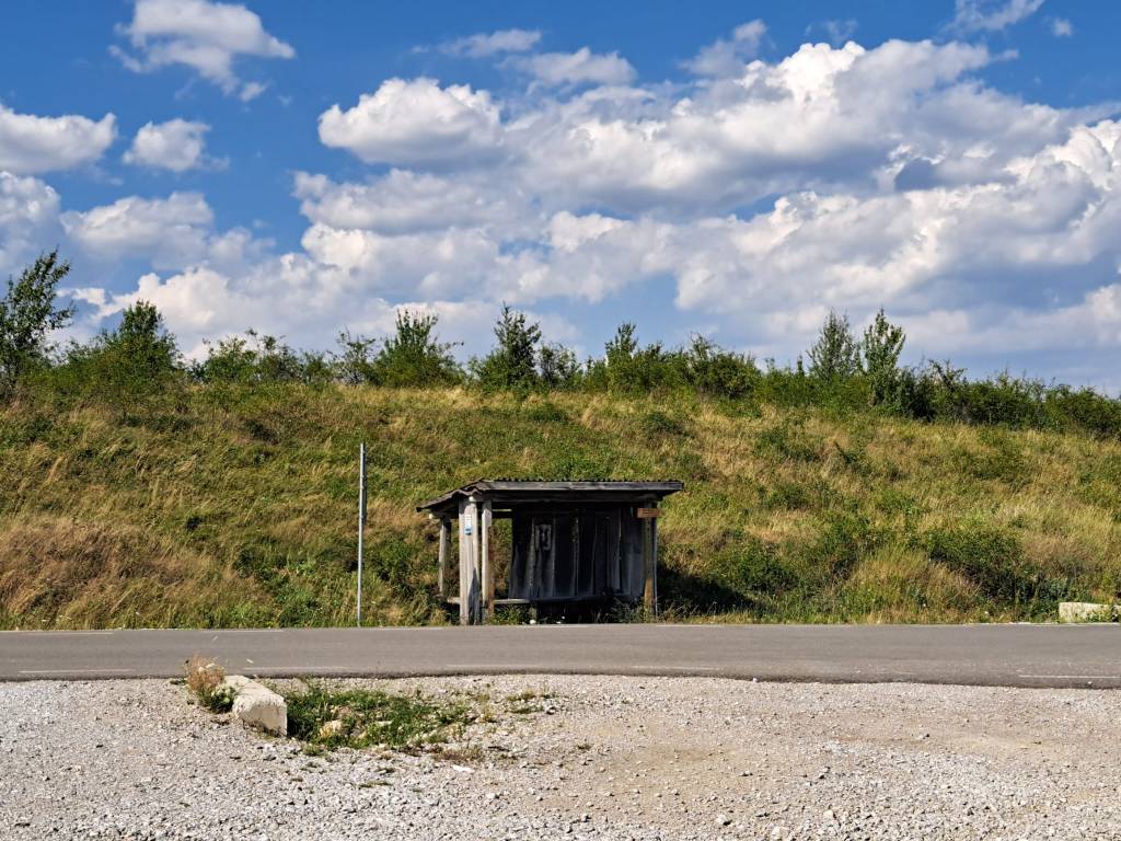 Drumul urcă, apoi coboară, dar rămâne la fel de bun, cam virajat și prea puțin marcat. În destule locuri este și îngust, așa că mai bine nu te întâlnești cu autobuzul care, dacă stații sunt, probabil și circulă, știe el când. O curbă în foarte ac de păr ne-a împins discret pe pietrișul ducând în decor. După ce am mulțumit în gând și am pozat panoul proiectului, am revenit pe traseu.