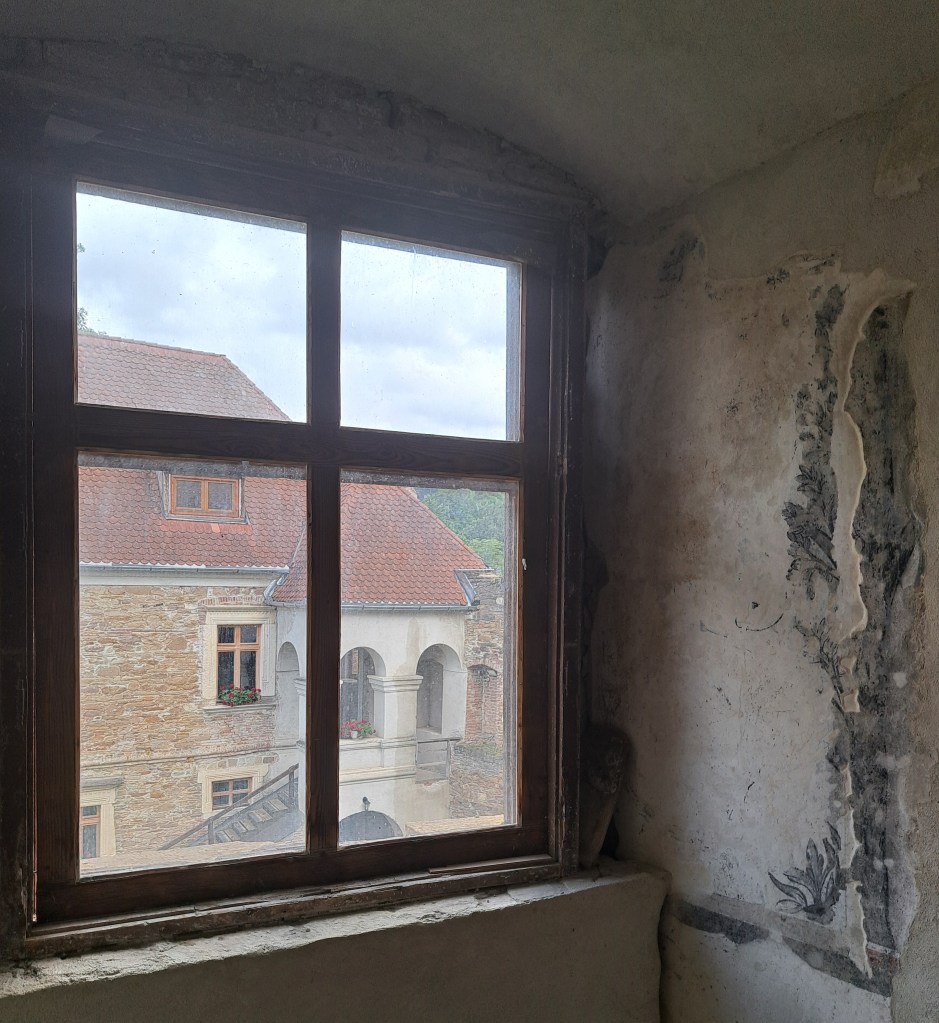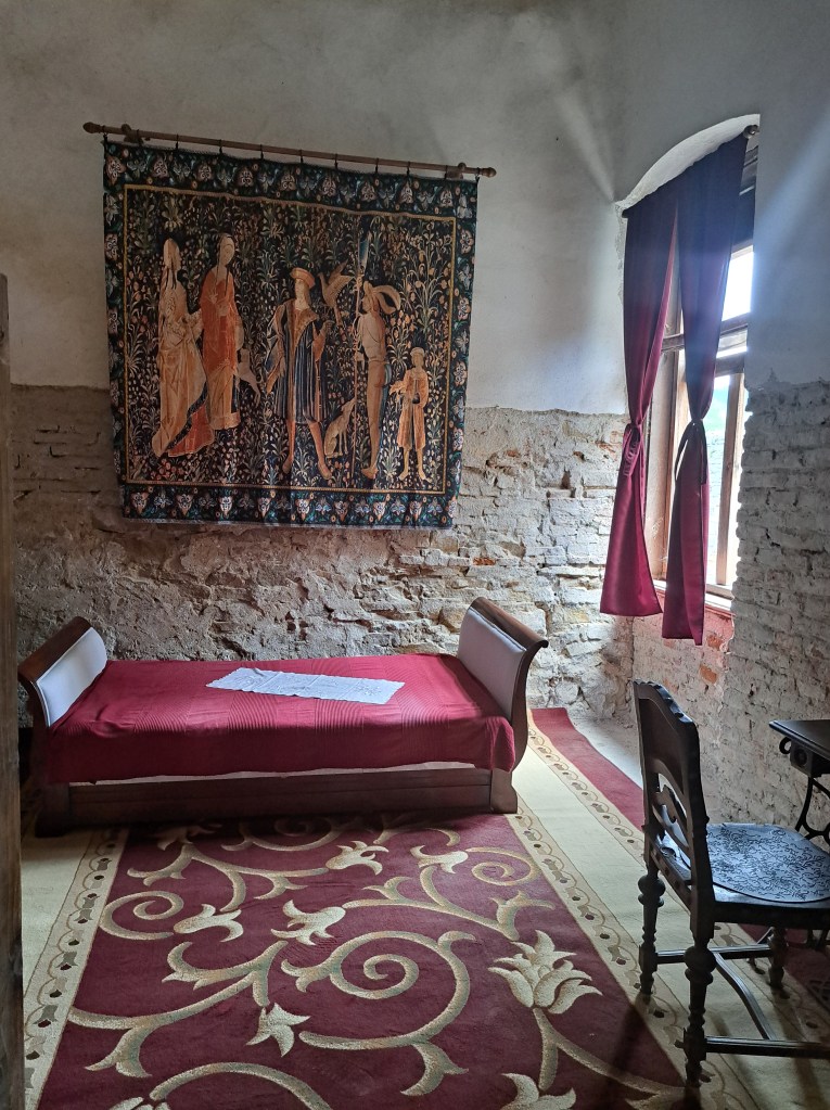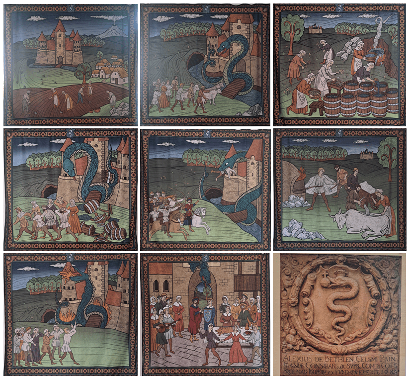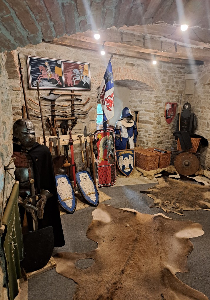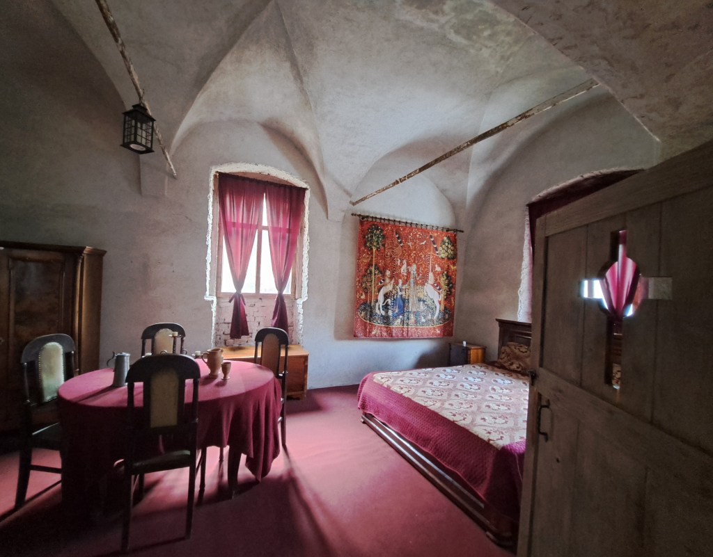 În Sala mare aurită, în locul galeriei de portrete vedem tapiseriile cu și citim legenda despre șarpele-dragon. Apoi remarcăm ogivele turnului octogonal, traversăm camerele de locuit, salonul de vânătoare și trecem în aripa vestică. Bolțile solide susțin donjonul pe care-l urcăm până la ambrazuri, din care coborâm în camerele înalte pe ale căror pereți gri sunt fotografii alb-negru cu interioarele de altădată.
