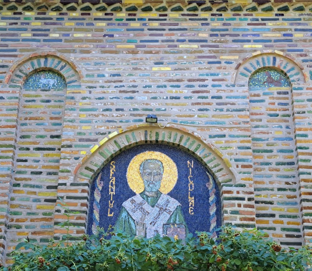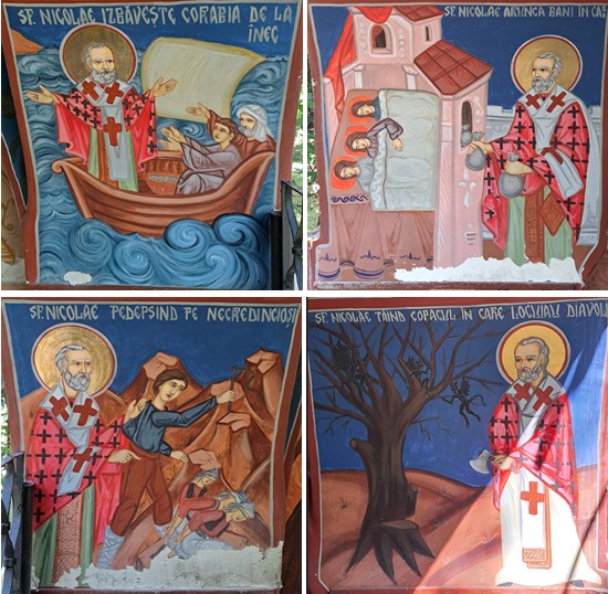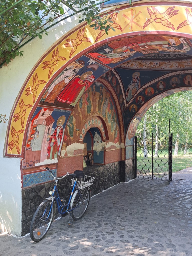 Drumul către mănăstirea cu hramul Sf. Nicolae începe pe strada Viitorului (o fi vreun semn 😊) și pătrunde printre dealuri cu stejari pe valea blândă săpată de pârâul Cobiuța, un firicel de apă pe care îl trecem când intrăm în curtea mănăstirii. La poartă străjuiește monumentul ridicat în 1933 de comuna Cobia în memoria fiiilor săi căzuți pe câmpul de onoare pentru întregirea neamului în primul război mondial, apoi și în al doilea. Avem și la noi în sat și ne plecăm frunțile de fiecare dată când vedem aceste monumente: sunt multe și comemorează prea multele vieți pierdute în războaie…  Aleea care duce spre biserică trece pe sub turnul-clopotniță care străjuia intrarea în incinta fortificată a fostei mănăstiri. Ajunși în curtea interioară, Sfântul Nicolae ne întâmpină binecuvântându-ne și îl vedem izbăvind corabia de la înec, aruncând cu bani în casă, tăind copacul în care locuiau diavolii și pedepsindu-i pe necredincioși. Fântâna îl așteaptă cu apă proaspătă pe călătorul însetat care și-a lăsat bicicleta sub bolta turnului, desigur și pe noi ceilalți veniți călare sau pe jos…
