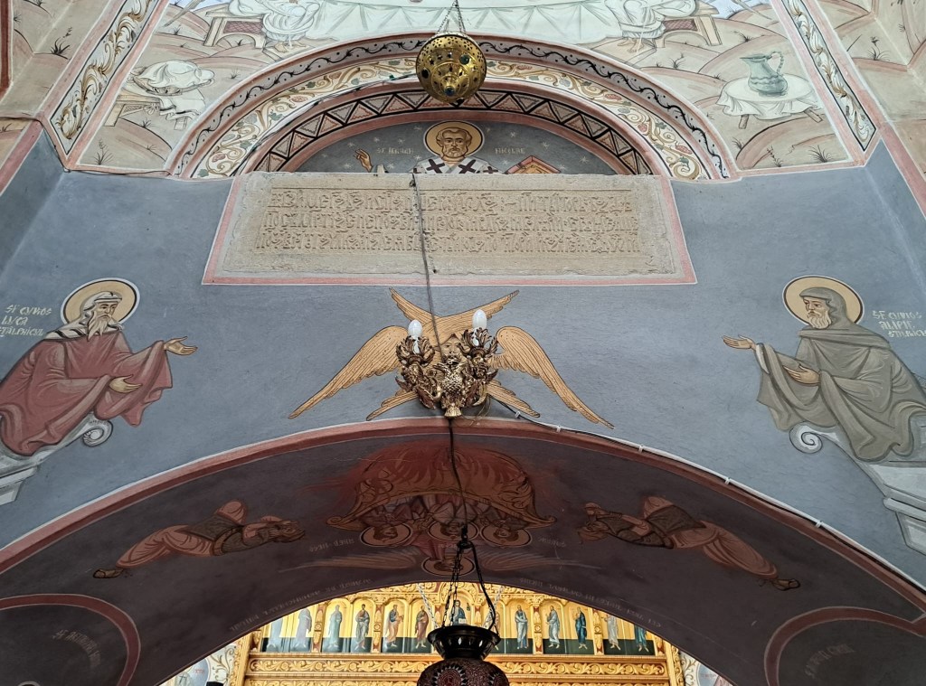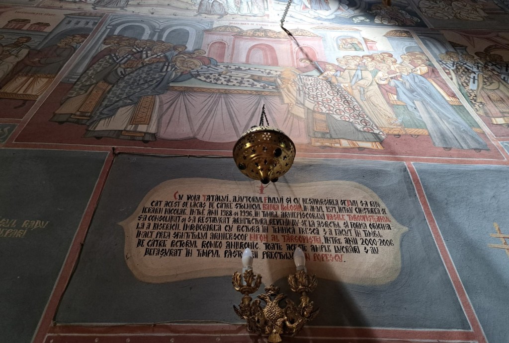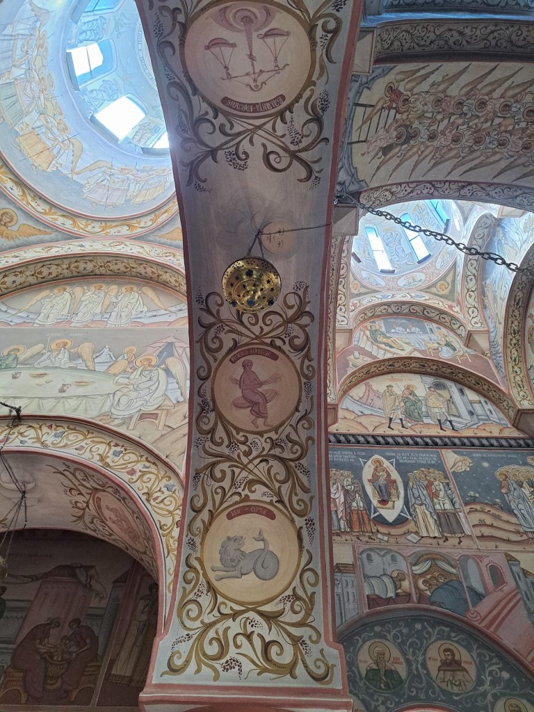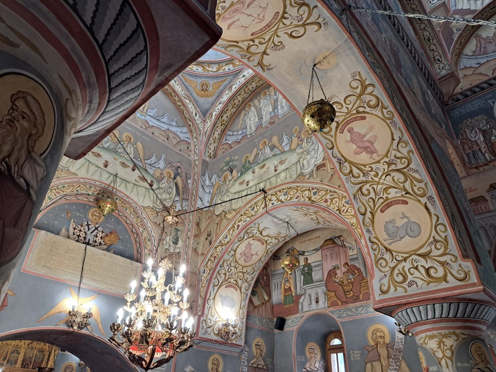 Frapează semnele zodiacale pictate pe bolțile interioare despre care preotul ne-a spus că, la fel ca întreaga pictură, caută să exprime spiritul luminat al ctitorului. L-am întrebat și dacă putem să facem poze, iar preotul ne-a răspuns cu tâlc, „puteți, dar să vă și rugați!”. Ne-ar fi plăcut să putem admira și ușile sculptate în lemn ale bisericii (1723) însă a trebuit să ne mulțumim doar cu releveele de la 1928 ale acestora, originalele fiind păstrate, zic unii, la Muzeul Mănăstirii Sinaia (alții că la Muzeul Național de Istorie a României).