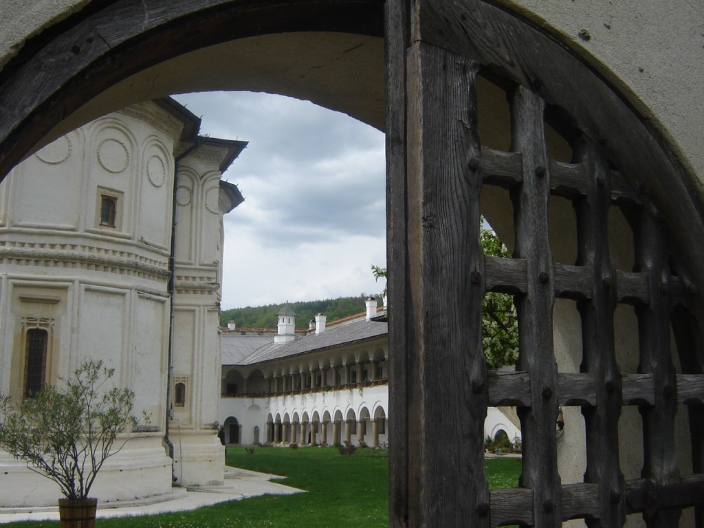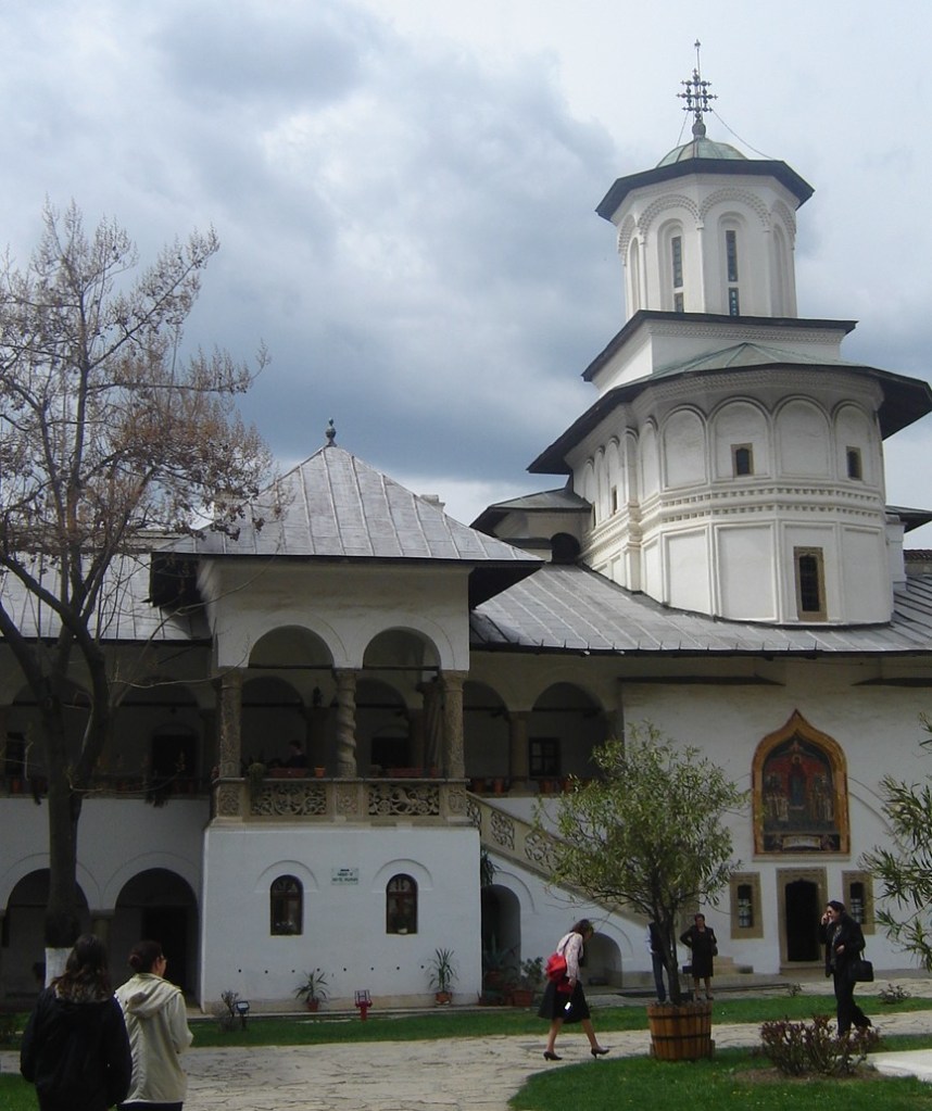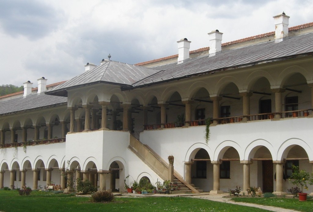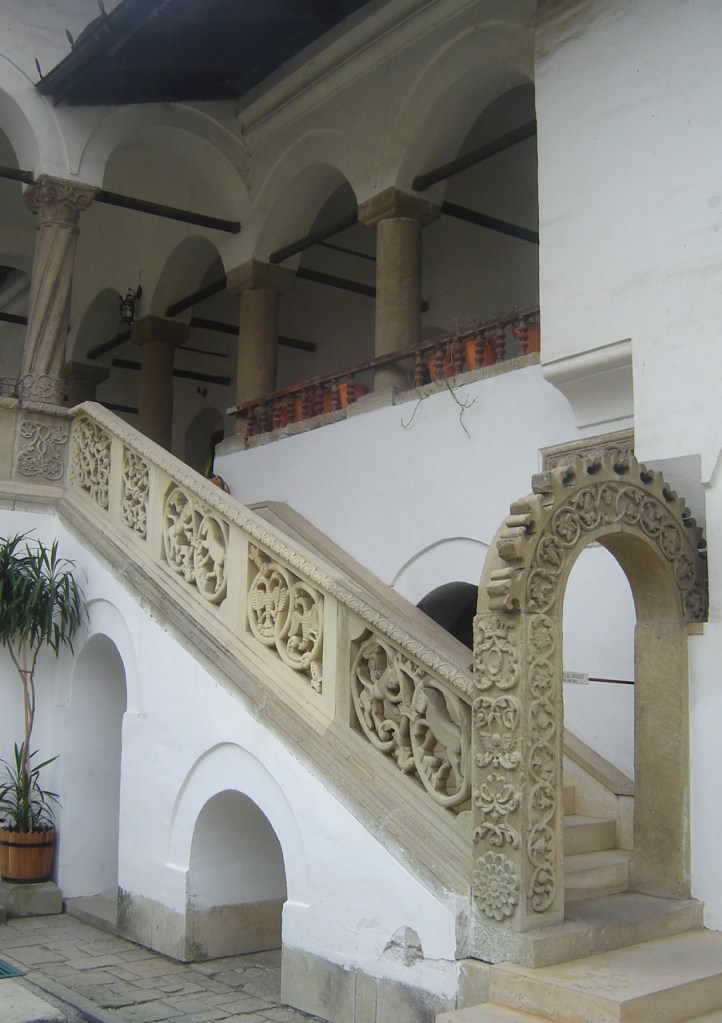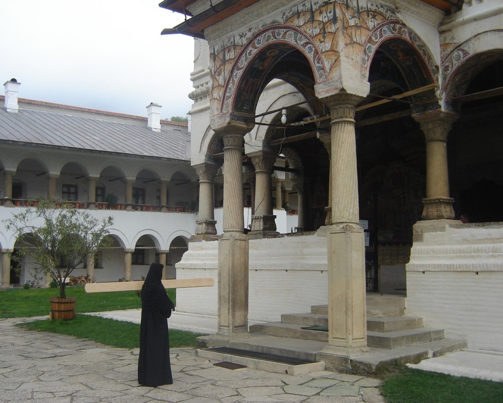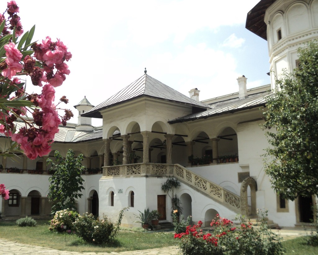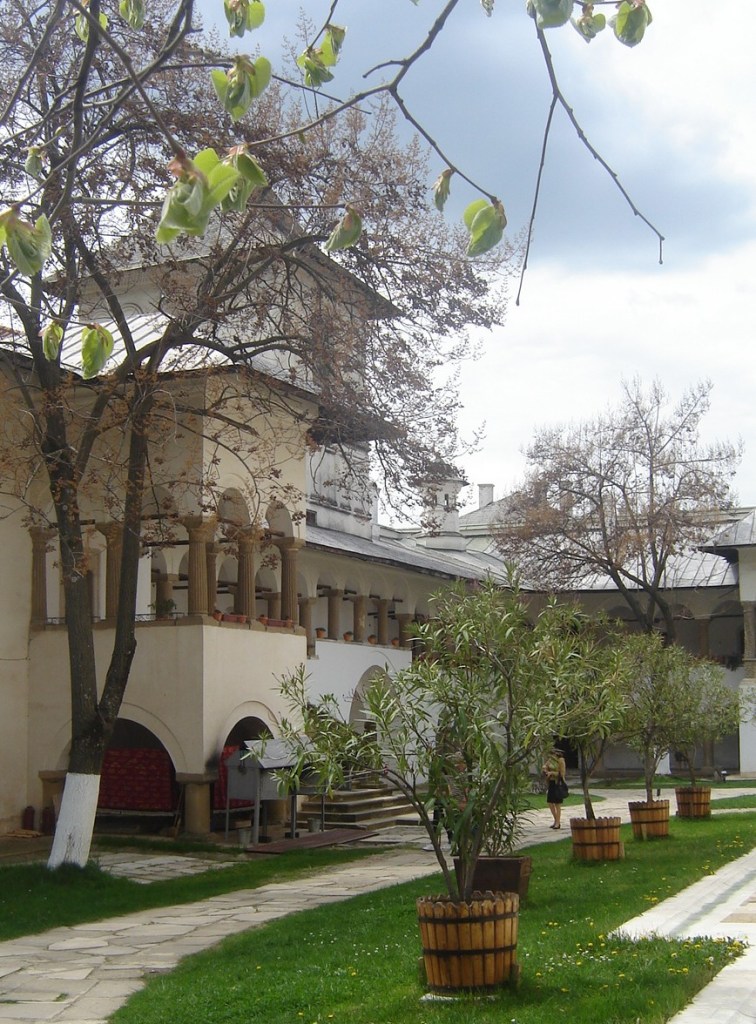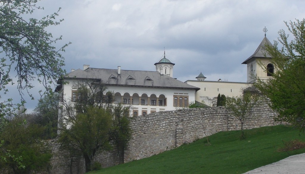 Două văcuțe pășesc agale pe lângă drumul urcând lin spre mănăstire. O băbuță și-a lăsat punga cu cine știe ce, se sprijină în toiag și cată cu liniște curioasă spre parcarea de vizavi: câți or mai veni și azi să viziteze? Nimeni nu se informează la punctul de informare turistică, toată lumea merge țintă spre poarta mănăstirii. Este înnorat, cam ca vremurile în care domnitorul a ridicat-o, lucru întărit de piatra zidurilor care o înconjoară și turnul care-i păzește semeț poarta. Pe panoul maro româno-anglo-francez citim că suntem în fața unui monument înscris (din 1993) pe Lista Patrimoniului Mondial UNESCO, un „ansamblu monastic unic în sud-estul Europei, sinteză bizantină a tradiției ortodoxe, edificată după tipicul marilor mănăstiri de la Muntele Athos”. O fântână care dă apă bună din secolul 19 se arată pe dreapta, dar încă nu ne e sete și pășim pe sub turnul-clopotniță în incinta mănăstirii. În față ne apare biserica treflată cu hramul Sfinților Împărați Constantin și Elena. Seamănă mult cu cea de la Curtea de Argeș, aduce și cu Cozia, este de aici. Privim spre dreapta, către arcadele casei domnești. Apoi, cu toată echidistanța, spre stânga, unde se află paraclisul (1697) și trapeza. Ne atrag privirile balustrada și coloanele diferit (nu-s la fel!) și migălos cizelate ale foișorului. Câtă pricepere, dar câtă răbdare să fi avut un anume Iosif, meșterul pietrar care le-a lucrat, al cărui nume apare în pisania de la baza scării?
