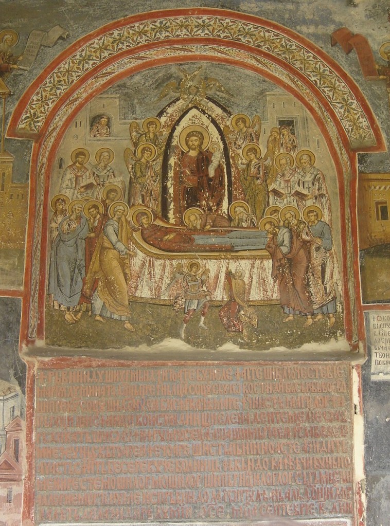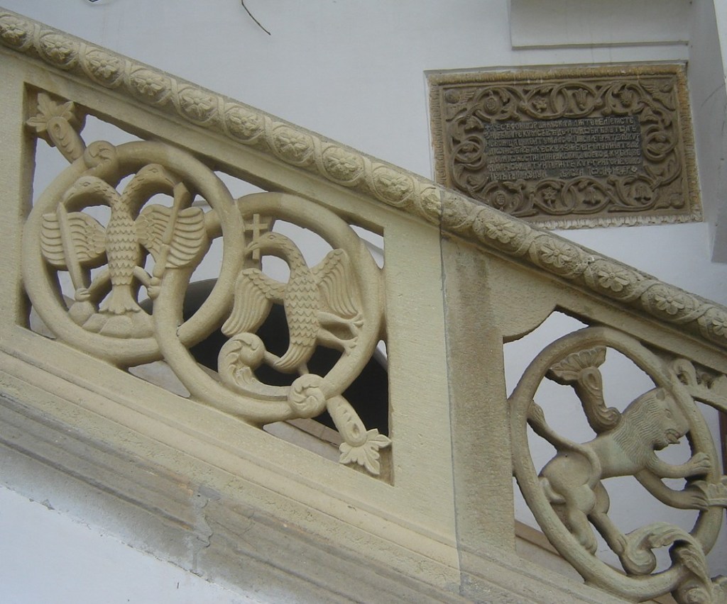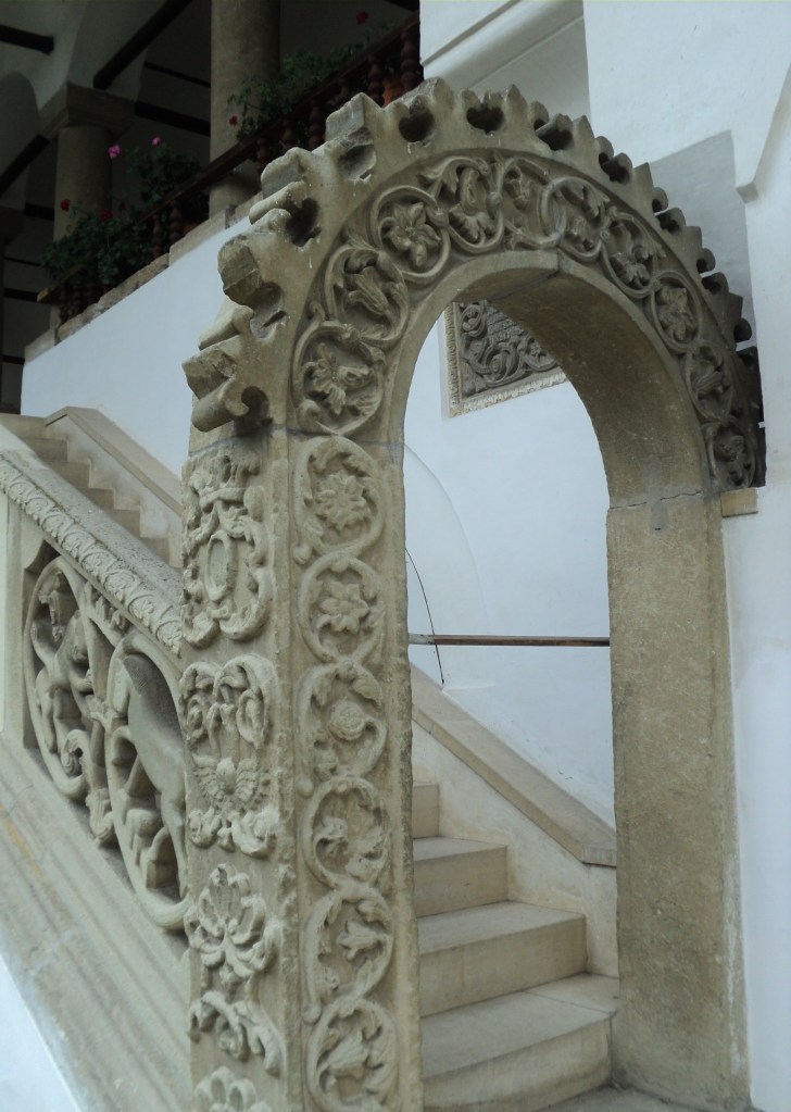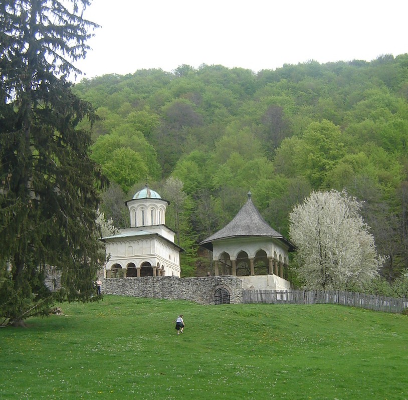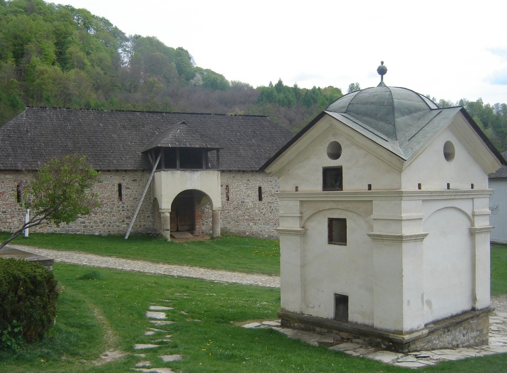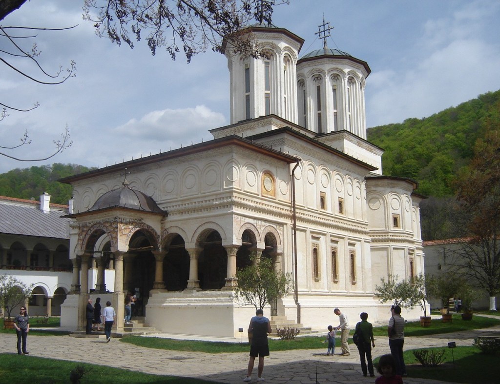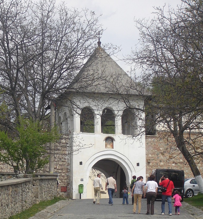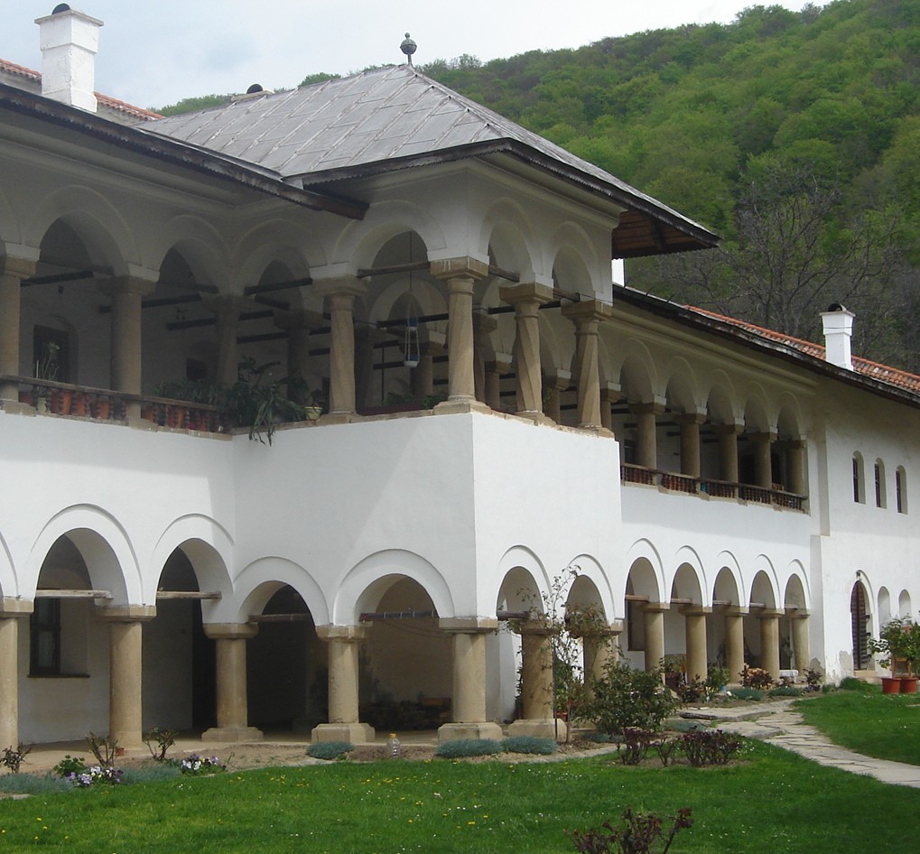 Două văcuțe pășesc agale pe lângă drumul urcând lin spre mănăstire. O băbuță și-a lăsat punga cu cine știe ce, se sprijină în toiag și cată cu liniște curioasă spre parcarea de vizavi: câți or mai veni și azi să viziteze? Nimeni nu se informează la punctul de informare turistică, toată lumea merge țintă spre poarta mănăstirii. Este înnorat, cam ca vremurile în care domnitorul a ridicat-o, lucru întărit de piatra zidurilor care o înconjoară și turnul care-i păzește semeț poarta. Pe panoul maro româno-anglo-francez citim că suntem în fața unui monument înscris (din 1993) pe Lista Patrimoniului Mondial UNESCO, un „ansamblu monastic unic în sud-estul Europei, sinteză bizantină a tradiției ortodoxe, edificată după tipicul marilor mănăstiri de la Muntele Athos”. O fântână care dă apă bună din secolul 19 se arată pe dreapta, dar încă nu ne e sete și pășim pe sub turnul-clopotniță în incinta mănăstirii. În față ne apare biserica treflată cu hramul Sfinților Împărați Constantin și Elena. Seamănă mult cu cea de la Curtea de Argeș, aduce și cu Cozia, este de aici. Privim spre dreapta, către arcadele casei domnești. Apoi, cu toată echidistanța, spre stânga, unde se află paraclisul (1697) și trapeza. Ne atrag privirile balustrada și coloanele diferit (nu-s la fel!) și migălos cizelate ale foișorului. Câtă pricepere, dar câtă răbdare să fi avut un anume Iosif, meșterul pietrar care le-a lucrat, al cărui nume apare în pisania de la baza scării?