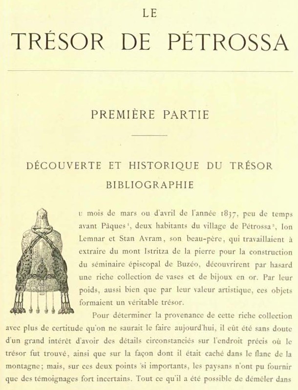 Era în postul Paștelui al anului 1837. „Eu, Ion Lemnaru…mărturisesc că acest socriu-meu, tocmindu-să cu iconomu Sfintei Episcopii Buzău ca să facă niște ferestre pentru biserică, după ce s-a întors acasă, ne-am întâlnit amândoi și după ce am primit doi icosari arvuna, am plecat să căutăm pietre îndemânatice pentru acea trebuință. Şi am găsit o piatră supt viia ardelenilor, pă care, începând a o dezgrădi, prin săpare în pământ, ca până la brâul omului, am găsit niște lucruri de aur, vârâte între două pietre, adică între cea care se găsise bună pentru ferestre și care era culcată și cealaltă, ce era pusă în picioare despre nămezi, în bucăți…”, zice declarația celui care, aparent, nu știa să scrie! Două monumente marchează locul. Primul, din 1979, e mai simplu, în stilul unei fântâni turcești. Al doilea, mai recent, e făcut din calcar de meșterii pietrari din Năeniul vecin și ilustrează, de la est la vest, cum au venit și vizi/ostro(?)-goții cărora le-a aparținut: vasul octogonal, talerul, fibula mare, patera și vasul oenochoe. Locul presupus a fost, în cele din urmă, acceptat pentru că disputa între mănăstirile Bradu și Sf. Gheorghe Nou, care administrau moșiile Pietroasa, respectiv Istrița, a fost tranșată în favoarea primei, chiar dacă pe a doua se găsiseră comori în alte încă trei locuri! Pietrarii au ascuns obiectele și le-au vândut un an mai târziu lui Anastase sârbul, arnăut din Bitolia, care ba le-a vândut, ba le-a îngropat lângă podul Câlnăului. De aici a recuperat banul Mihail Ghica, fondatorul viitorului Muzeu Național de Istorie al României, cele 12 piese (după unele surse 16, 17, 26 sau chiar 27!) „neluate de viituri”.